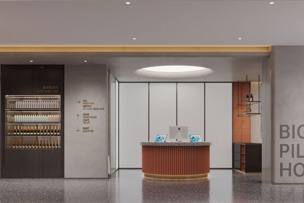 山水詩畫,濃淡相宜。一條飄逸的絲帶裝置藝術(shù)燈貫穿整個接待前廳,成為原本略顯狹長的前廳里一道美麗的風(fēng)景線。遠山如黛,松迎客至!