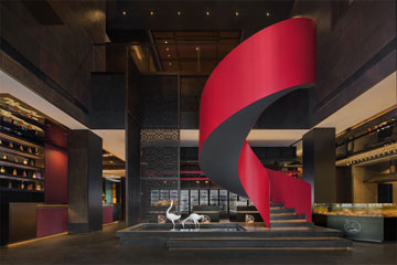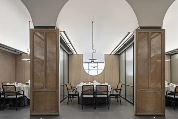 山居榮府中餐廳設(shè)計(jì)以富春江白鷺為題,借富春江兩岸初秋景色為依托,從店面的LOGO形象到軟裝陳設(shè),都由此統(tǒng)一展開(kāi)。進(jìn)入門廳區(qū)域,是一副白鷺?biāo)畱驁D,旁邊旋轉(zhuǎn)而上的中國(guó)紅樓梯,是整個(gè)空間一大亮點(diǎn)。逶迤蜿蜒的造型,連接多元空間的同時(shí),也是冷靜素雅的直線條里穿插的超級(jí)印象符號(hào)。兩側(cè)是吧臺(tái)與明廚分廳而立。右手邊通透簡(jiǎn)明的明廚,模糊......